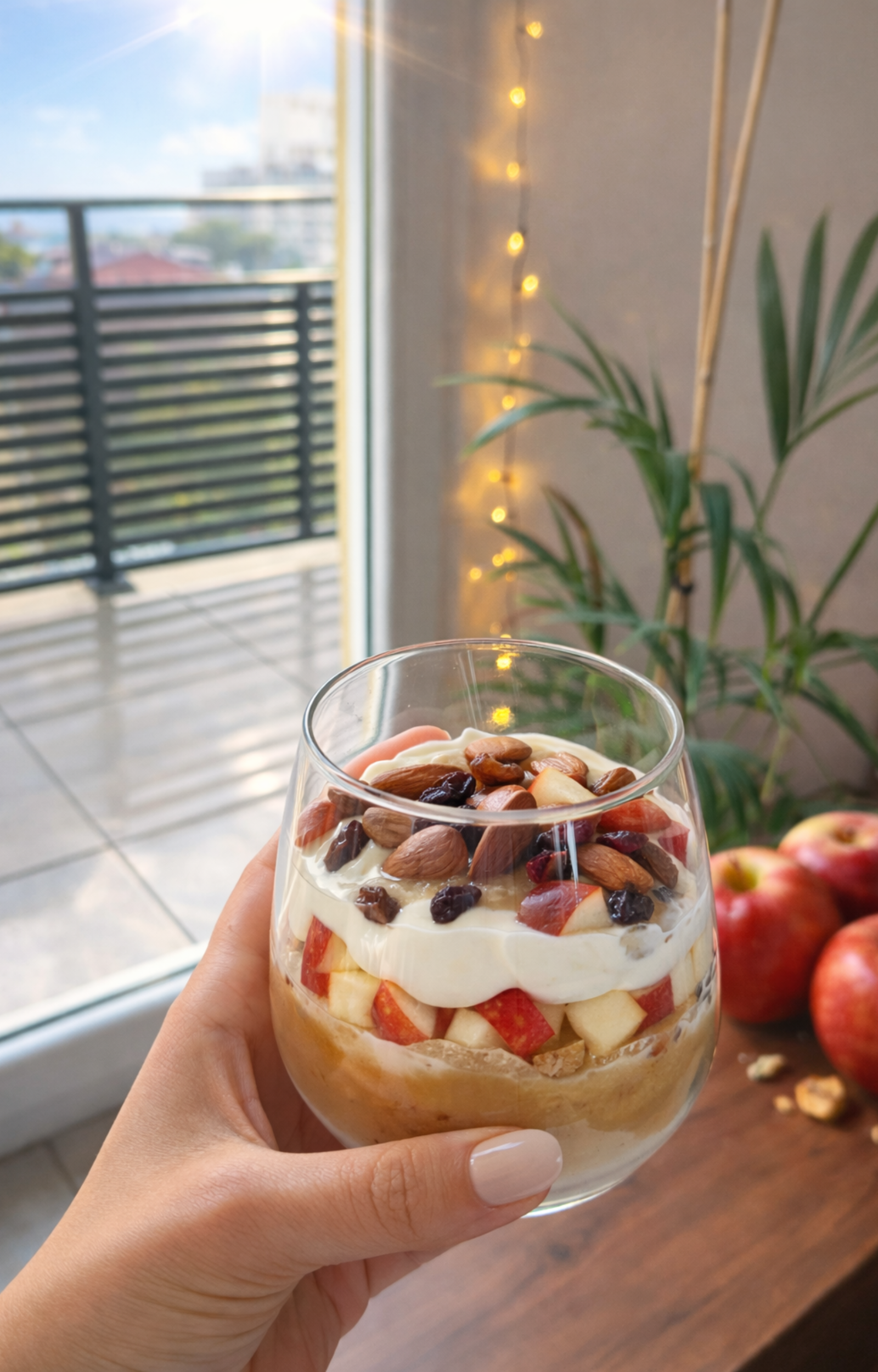 - In un recipiente, crea degli strati: uno strato di yogurt naturale, un po’ di composta di mele (fatta in casa o acquistata), qualche pezzo di mela e un ultimo strato di yogurt.