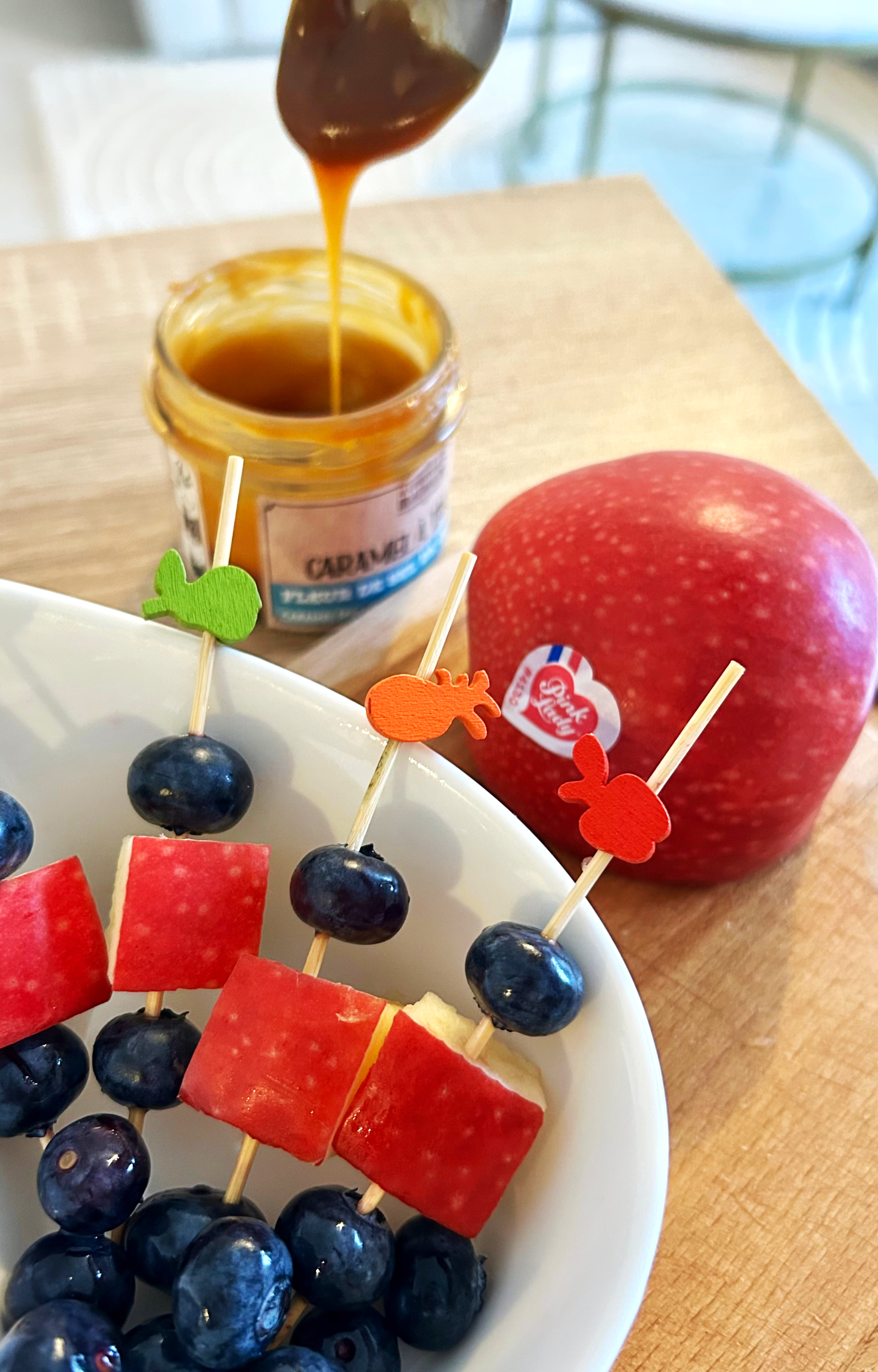 - Infine, servi gli spiedini di mele e mirtilli con un filo di caramello, che si abbinerà perfettamente ai sapori equilibrati dei mirtilli.