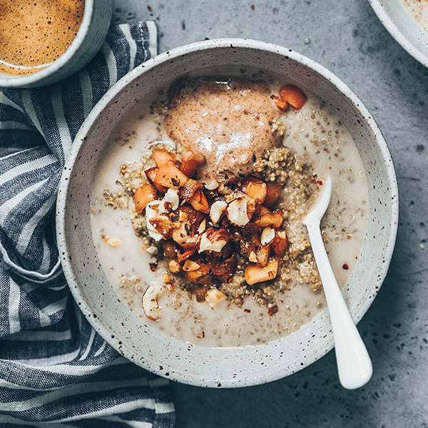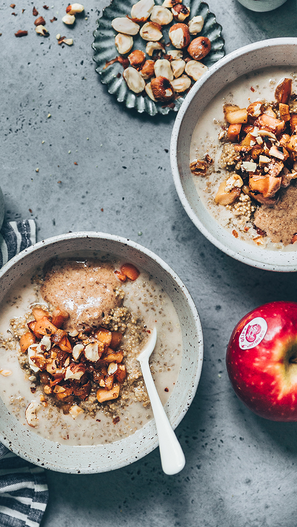 - Servire il porridge accompagnato dalle mele caramellate, dalle nocciole tritate e da un cucchiaio di crema di mandorle.