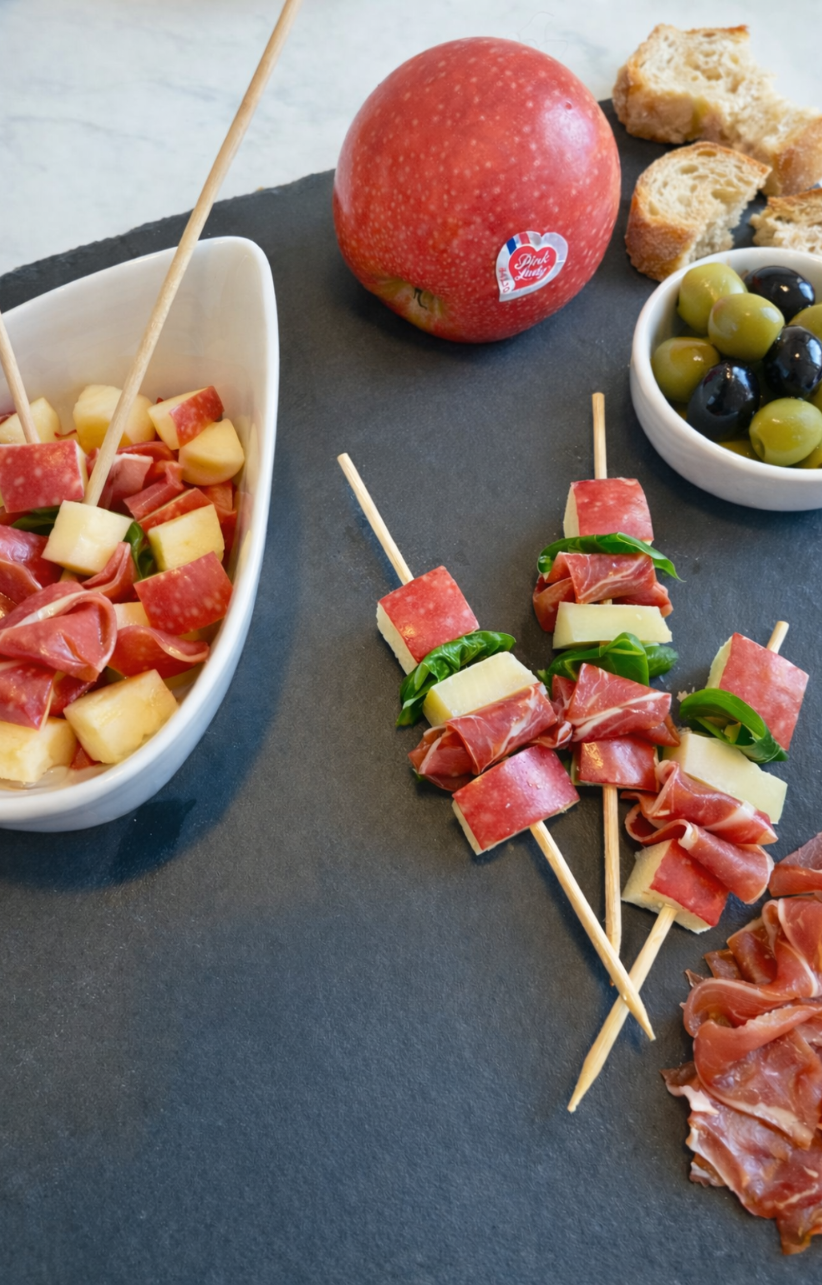- Su uno spiedino, alternare un pezzo di mela, un pezzo di formaggio Comté, una fetta di prosciutto Serrano e della rucola (o della valeriana).