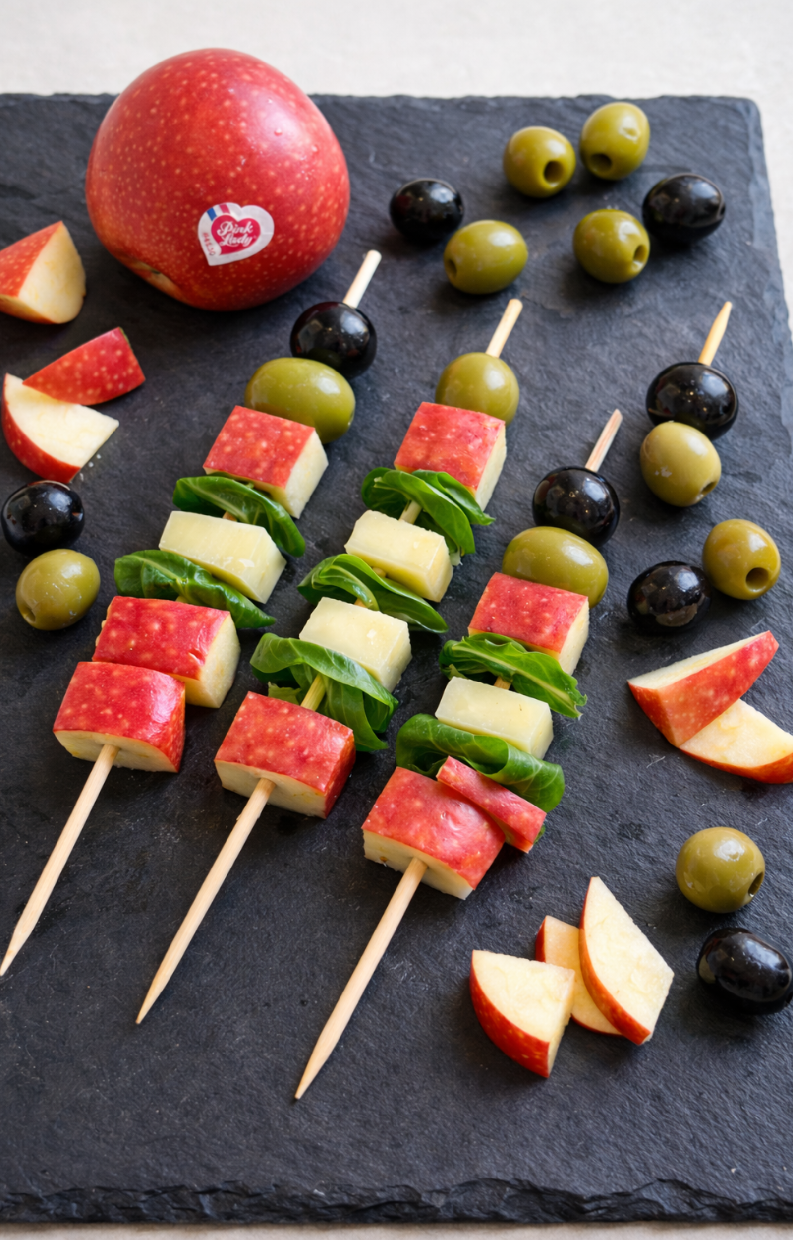- Per un aperitivo sano e di successo, accompagna i tuoi spiedini di mele Pink Lady® con pane tostato e paté di olive!