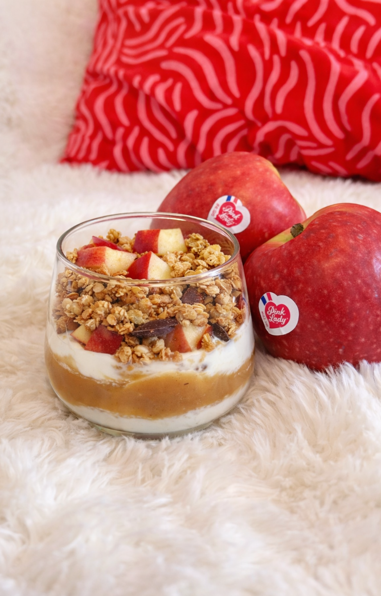 - In un recipiente, crea degli strati: uno di yogurt naturale, un po’ di composta di mele (fatta in casa o acquistata), qualche pezzo di mela e un ultimo strato di yogurt.