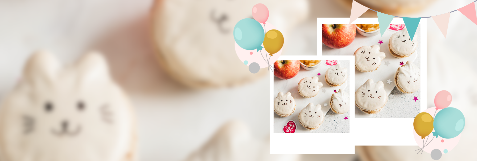 Ces macarons aux pommes, en forme de tête de chat, allient originalité et gourmandise. Préparés avec du sucre, de la poudre d’amandes, des blancs d’œufs et une compotée de pommes PinKids®, ils offrent une alternative sans gluten idéale pour le goûter des enfants.