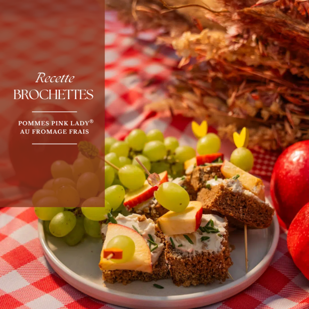Sur un simple pique en bois, alternez un morceau de pain tartiné de fromage frais à la ciboulette, une tranche de pomme Pink Lady® ainsi qu’un raisin et le tour est joué. Une bouchée originale, pleine de fraîcheur et de contraste.