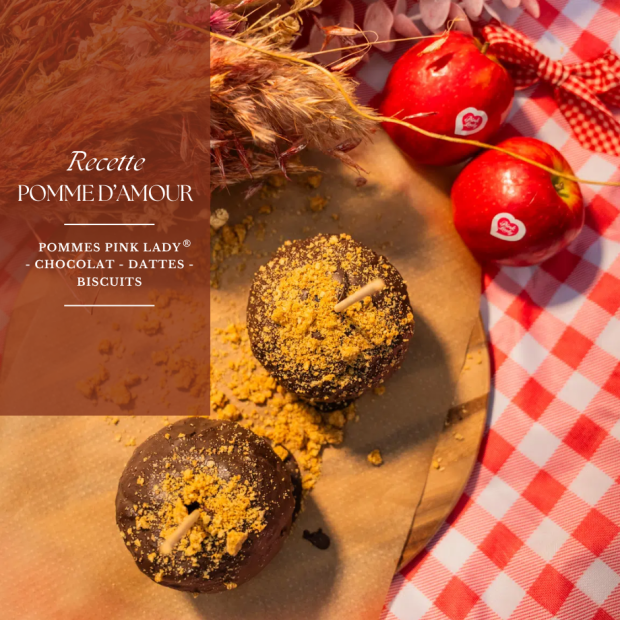 Craquez pour cette revisite de la pomme d’amour version Pink Lady® : exit le sucre caramélisé rouge vif, place à une coque fondante à base de pâte de datte et de chocolat fondu.