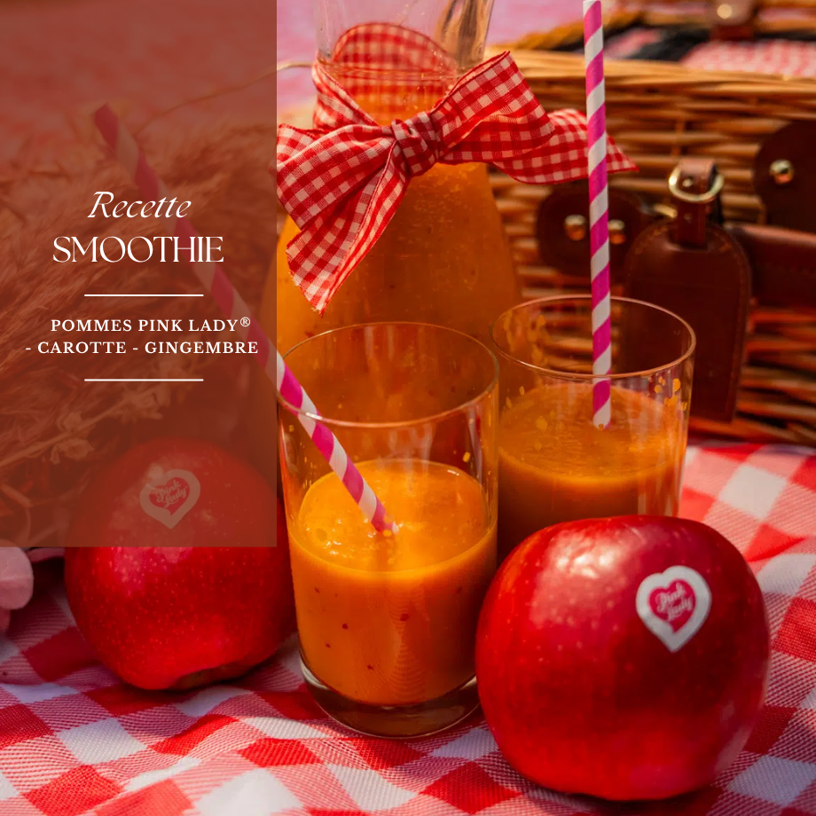 Ce smoothie pomme, carotte, citron vert et gingembre est une véritable cure de fraîcheur et de vitalité. La pomme Pink Lady® apporte sa douceur et ses fibres, la carotte regorge de bêta-carotène pour une peau éclatante, le citron vert booste l’immunité grâce à sa richesse en vitamine C, et le gingembre stimule la digestion tout en ajoutant une pointe de peps.