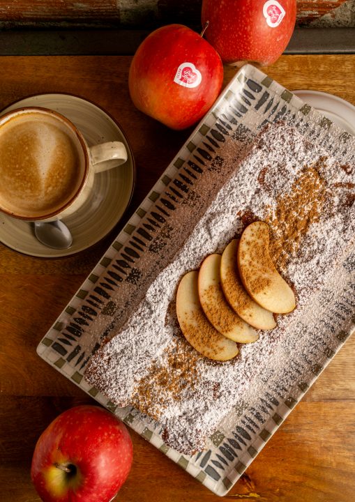 Además de por sus cafés excepcionales, el Kaldi Café cautiva también por la calidad de su repostería artesana, que incluye opciones sin gluten para deleitar a todos los paladares. Aunque la estrella indiscutible de su carta es la tarta de queso, que elaboran en varias versiones, el local ha reimaginado una tarta de manzana Pink Lady® y canela para la campaña “Meriendas Pink Lady®”. Una receta que realza el equilibrio perfecto entre la dulzura y la acidez de nuestra manzana Pink Lady®, ideal para disfrutar con un café perfectamente tostado.